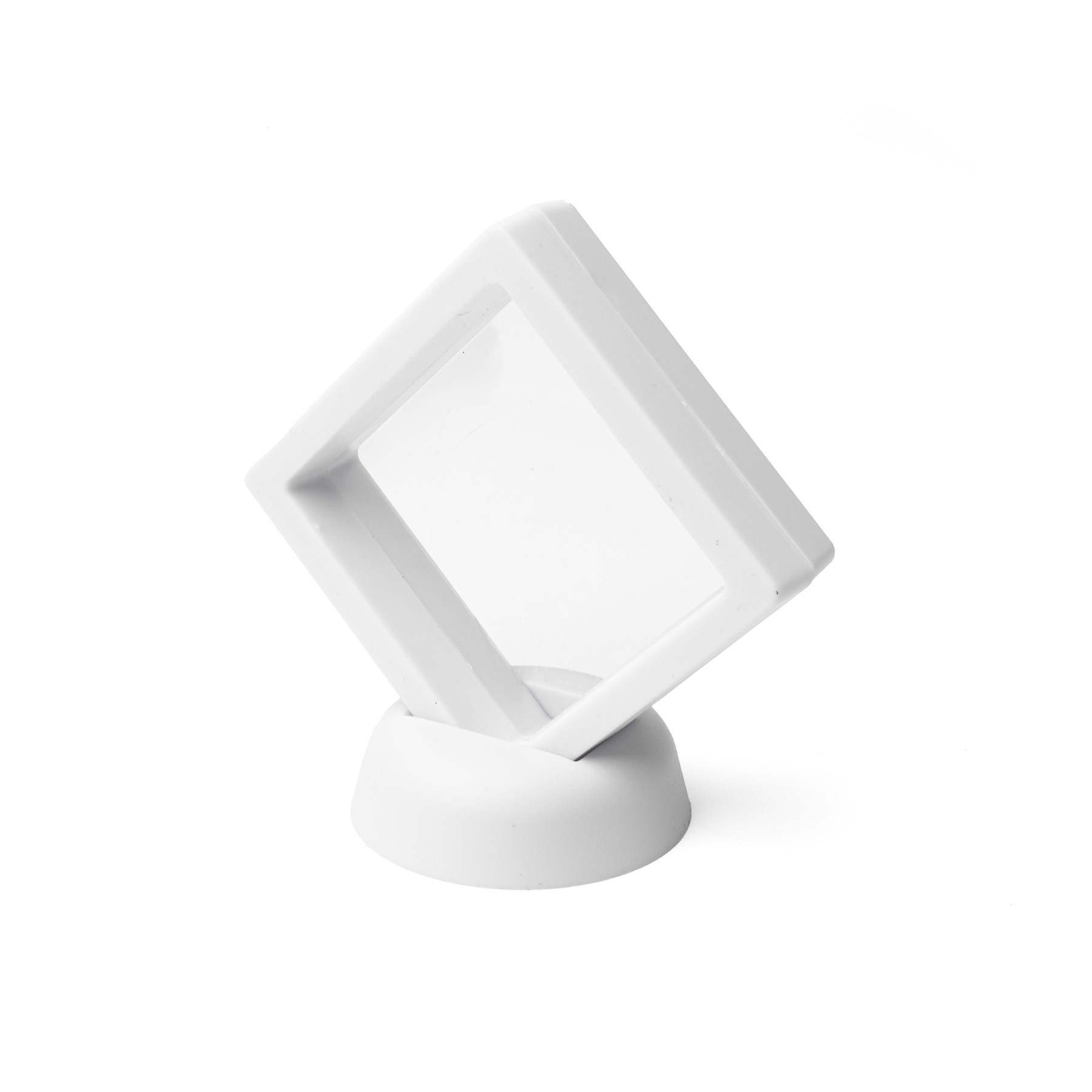 Le cadre en plastique est articulé et se compose de deux moitiés solides - une membrane souple en silicone transparent est attachée à chacune d'elles. Une fois ouvert, vous placez l'objet à l'intérieur et refermez le cadre. Les membranes fusionnent, épousent délicatement l'objet et le maintiennent fermement en place. Grâce à leur extrême élasticité, elles peuvent s'étirer jusqu'à environ 2 à 3 centimètres, ce qui leur permet d'accueillir facilement des objets plus grands ou plus volumineux. L'effet de "lévitation" et la visibilité totale de tous les côtés sont maintenus.