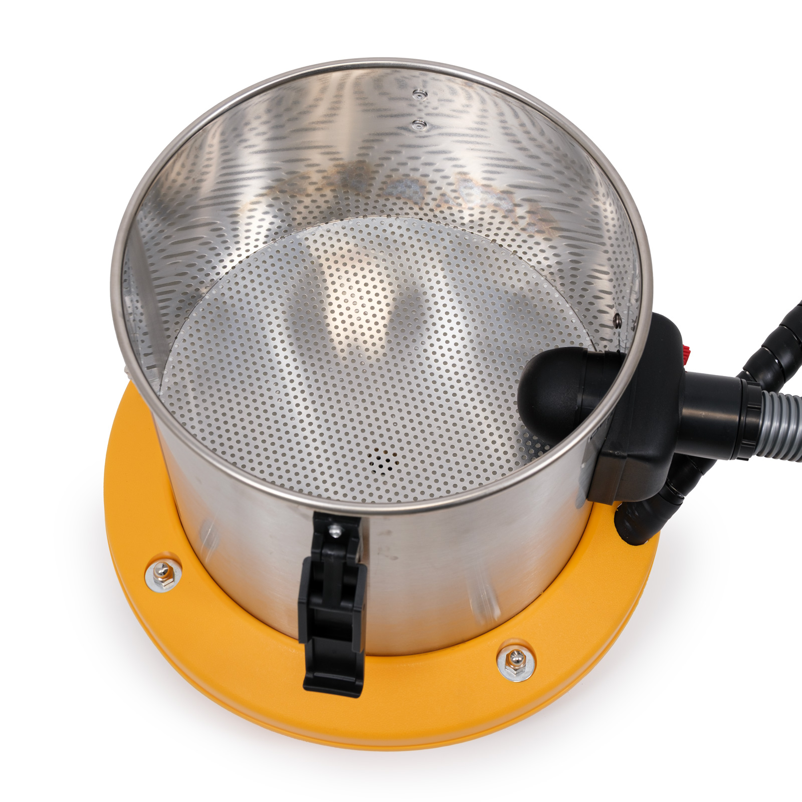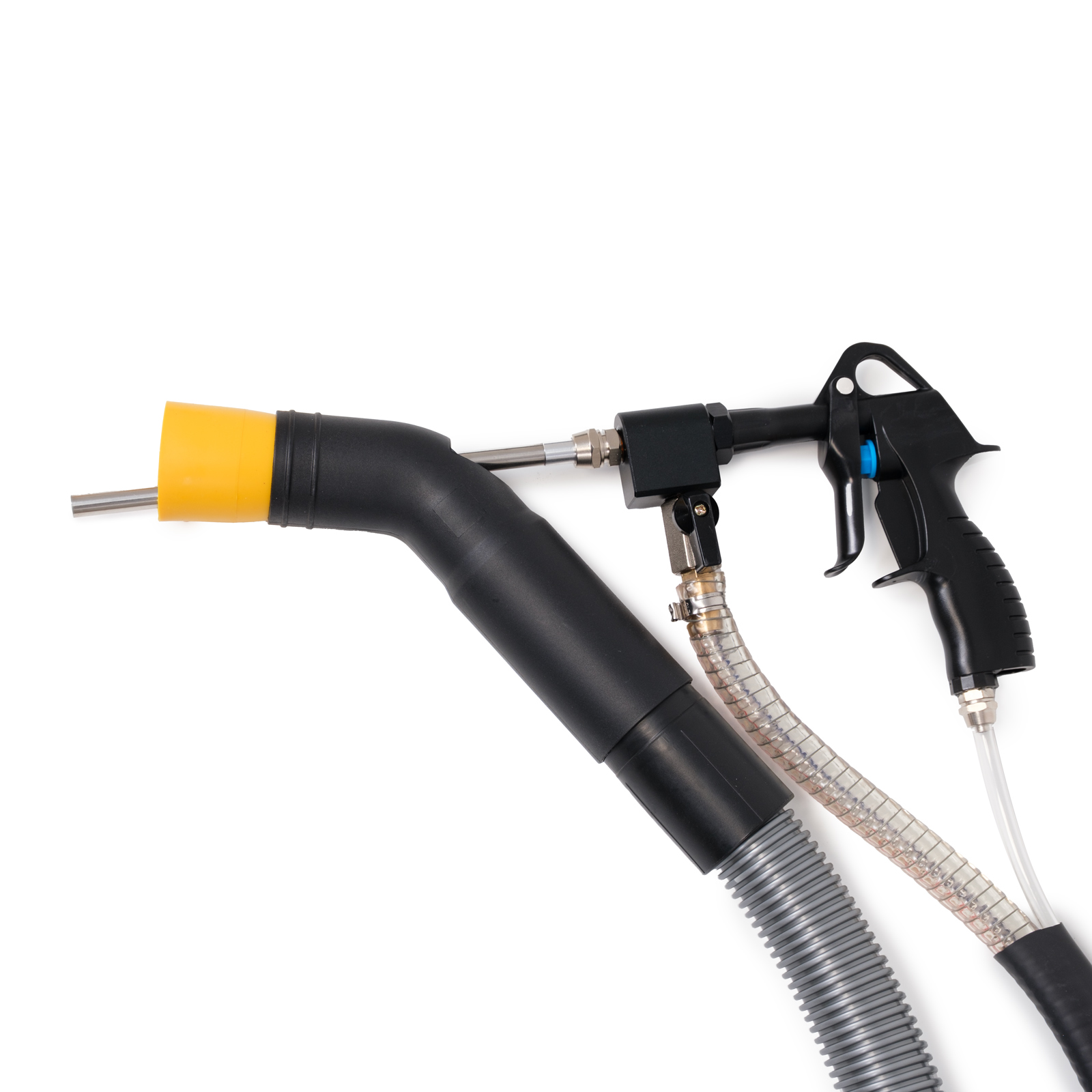 L'appareil se branche simplement sur une prise électrique et se connecte à une source d'air comprimé qui crée un flux pour la projection de l'abrasif. La grenaille de coquille de noix sèche est ensuite versée dans la trémie. L'air comprimé transporte l'abrasif à travers la buse et dans le canal d'admission, où un flux de matériau broie doucement les dépôts de carbone de la soupape d'admission. Dans le même temps, un second tuyau extrait automatiquement l'abrasif et les saletés détachées. Dans la trémie du Walnut Blaster se trouve un filtre qui sépare l'abrasif sale de l'abrasif propre, ce qui permet de réutiliser une partie des coquilles et de réduire les coûts d'exploitation au minimum.