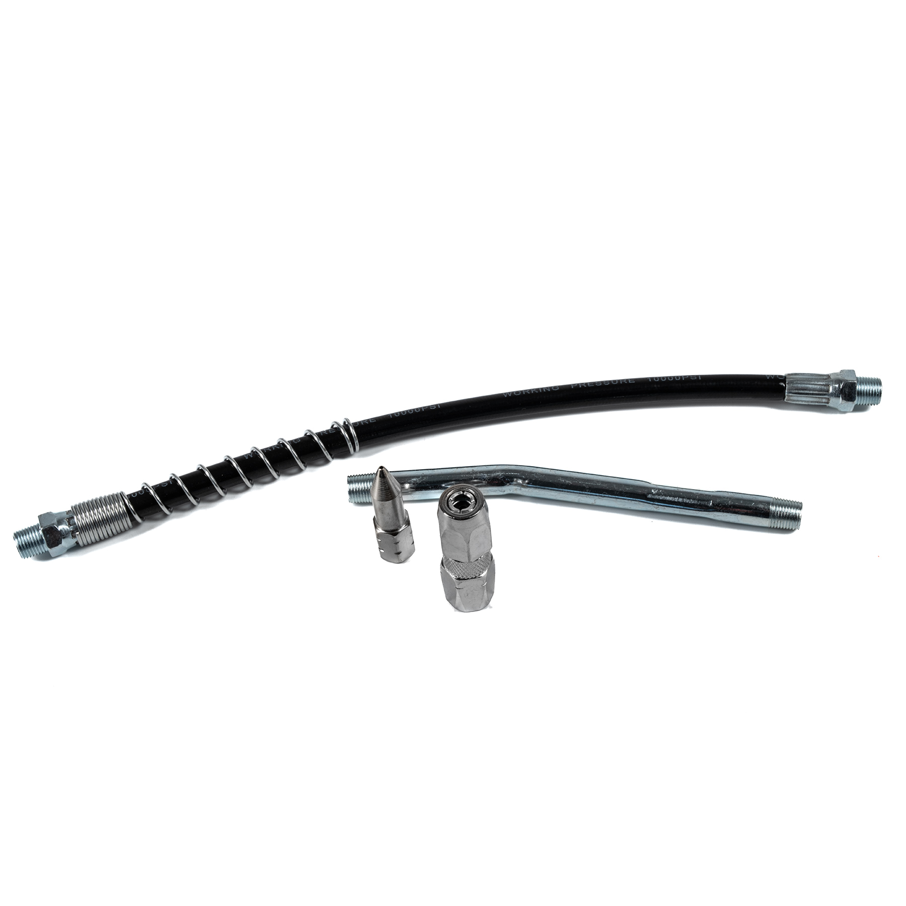 L'emballage comprend un tuyau de rallonge de 220 mm, une rallonge de buse métallique de 130 mm, une buse et un raccord rapide universel pour le raccordement à la lubrification centralisée des machines et des équipements.