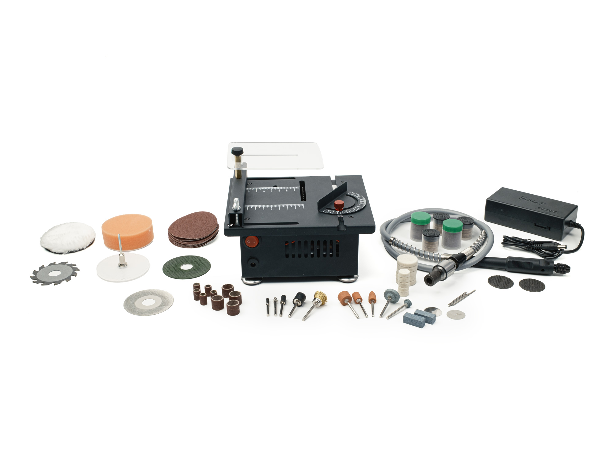 Emballage : mini scie à table, bowden, adaptateur électrique, grand ensemble d'accessoires, clés inbus