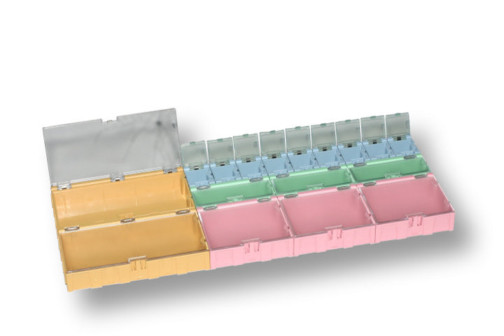En réorganisant les tiroirs de l'ensemble en fonction des dimensions des articles stockés, vous obtenez un système polyvalent de plateaux en plastique pour ranger, par exemple, des médicaments, des mèches de pêche, des boutons, des articles de couture, des vis, des rondelles et des petites pièces dans les ateliers.