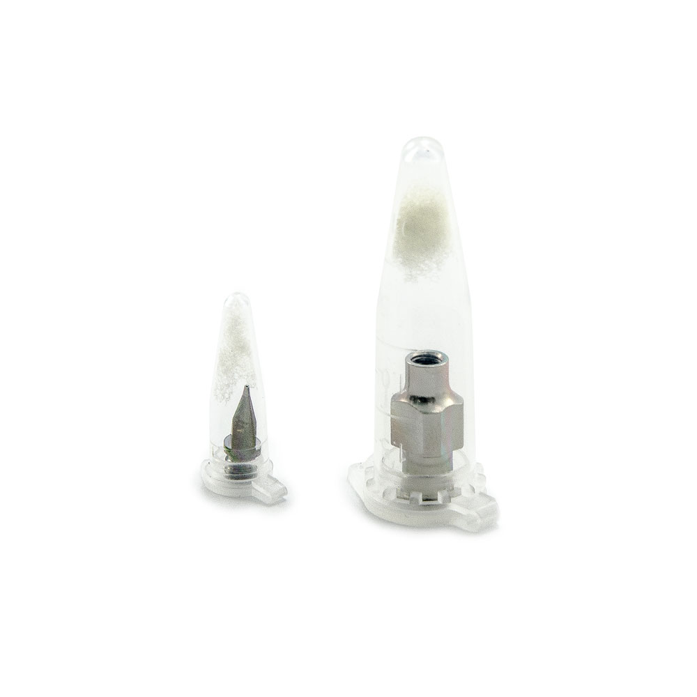 L'aiguille se compose de deux parties qui s'enfilent l'une dans l'autre : un embout pour la connexion à une cartouche ou à un adaptateur avec des terminaisons Luer-Lock et Luer-Slip, et la bouche de l'aiguille conique elle-même. Si nécessaire, l'aiguille peut être démontée en deux parties pour faciliter le nettoyage.