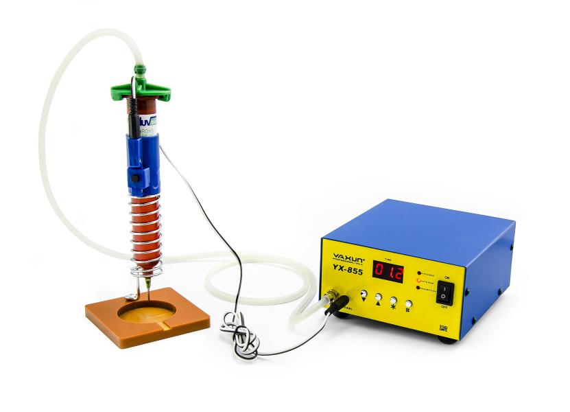 Distributeur d'adhésifs UV et de liquides plus fins Yaxun YX-855. Ce distributeur automatique de liquides est principalement conçu pour distribuer des adhésifs UV à partir de cartouches lors de la réparation d'écrans de téléphones portables ou de tablettes, où le verre de protection est collé à l'écran à l'aide d'adhésifs UV spéciaux durcissant à la lumière, ou pour distribuer d'autres substances moins visqueuses.