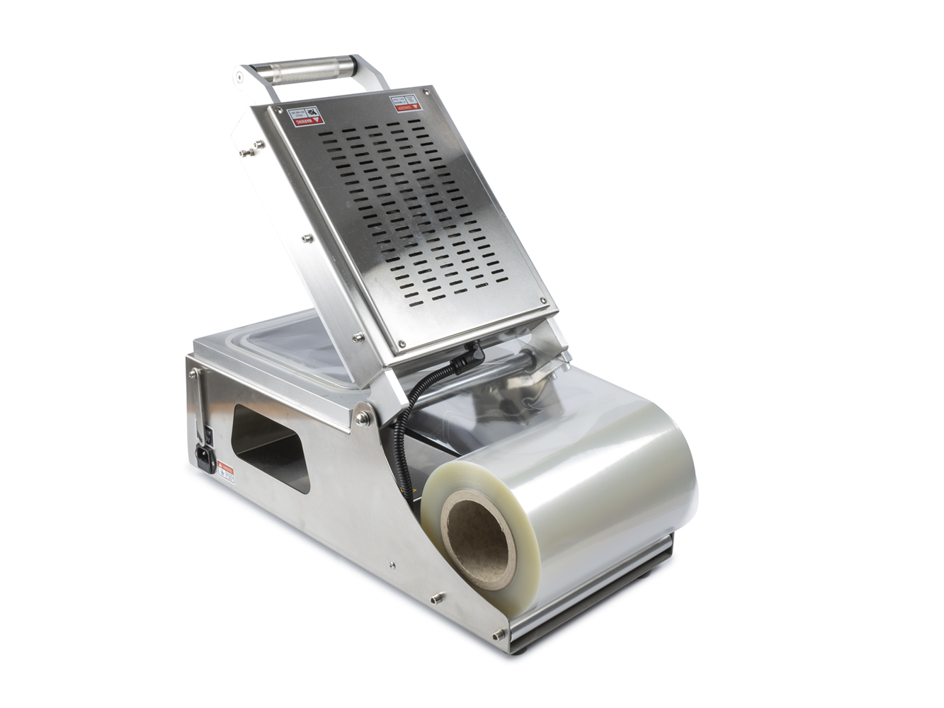 La plage de température est comprise entre 0 et 220°C. Une fois la température réglée, la plaque de soudure commence à chauffer immédiatement et, en un rien de temps, l'emballeuse est prête à sceller les barquettes. L'opérateur place simplement les barquettes dans la matrice de scellage, tire le film (PP/PET) sur la barquette et appuie sur le couvercle. Lorsque la pression est maximale, le film de scellage est également coupé de la bobine. Pour la bobine, il y a un plateau à l'arrière de la soudeuse de boîtes alimentaires qui a deux rouleaux rotatifs sur lesquels la bobine tourne pour faciliter la manipulation. La banderoleuse de boîtes repas convient pour les films PP/PET d'une largeur de 230 mm ou 185 mm. La banderoleuse est équipée d'un système de couteau intégré qui coupe automatiquement l'excédent de film lorsque le couvercle est pressé (en cas d'utilisation d'un film de 230 mm), ce qui rend le travail plus confortable lors de l'utilisation de films de plus grande largeur. Le diamètre extérieur maximum recommandé pour les rouleaux est de 160 mm. Pour les rouleaux plus grands, un dérouleur externe doit être utilisé.