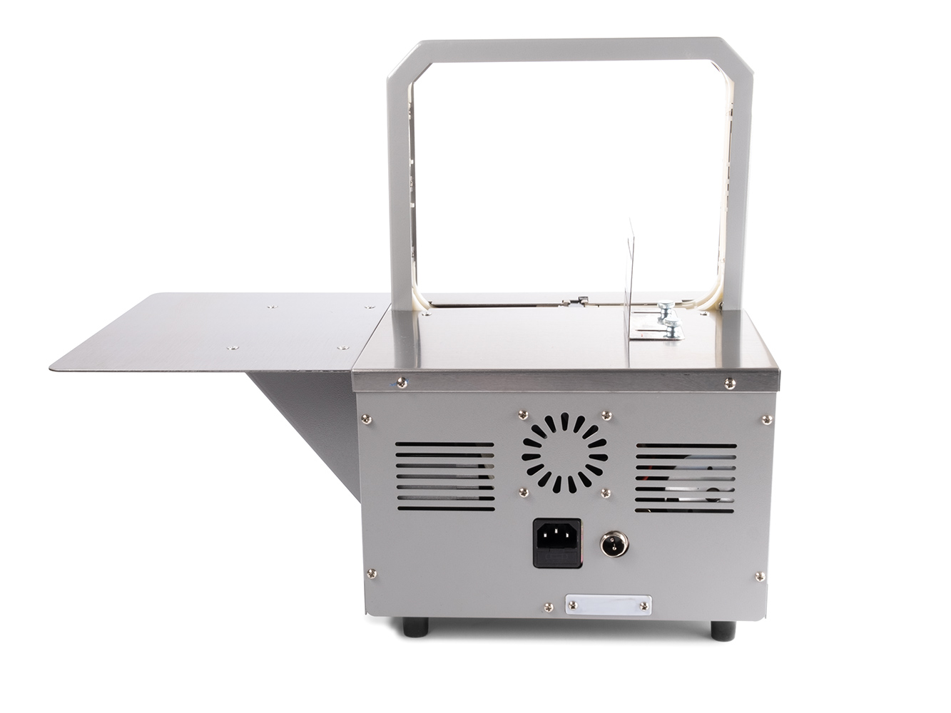 régler la température du cerclage, d'ajuster la force de serrage, de régler le délai du capteur optique et d'afficher le nombre de pièces cerclées. La table supérieure est en acier inoxydable et est équipée d'une table latérale pour le stockage des marchandises ; la table peut être fixée à la fois sur le côté gauche et sur le côté droit. L'ensemble comprend également des butées de verrouillage qui peuvent être fixées à la table d'emballage. Les butées peuvent être déplacées autour de la table pour définir l'endroit où le ruban adhésif sera fixé afin que toutes les marchandises soient toujours cerclées au même endroit. L'ensemble de la cercleuse est en métal (cadre en aluminium, châssis en acier), elle est massive mais compacte, le
