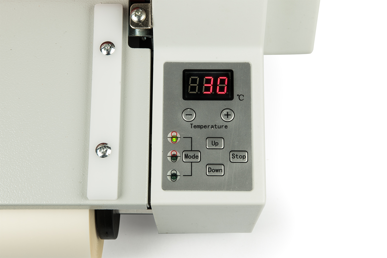 La plastifieuse V350 ne coupe pas le film et peut plastifier n'importe quelle longueur de papier d'une largeur maximale de 350 mm. Il est possible de régler le chauffage pour le rouleau supérieur, le rouleau supérieur et le rouleau inférieur ou de désactiver le chauffage pour les deux rouleaux (convient pour la plastification à froid avec un film autocollant).