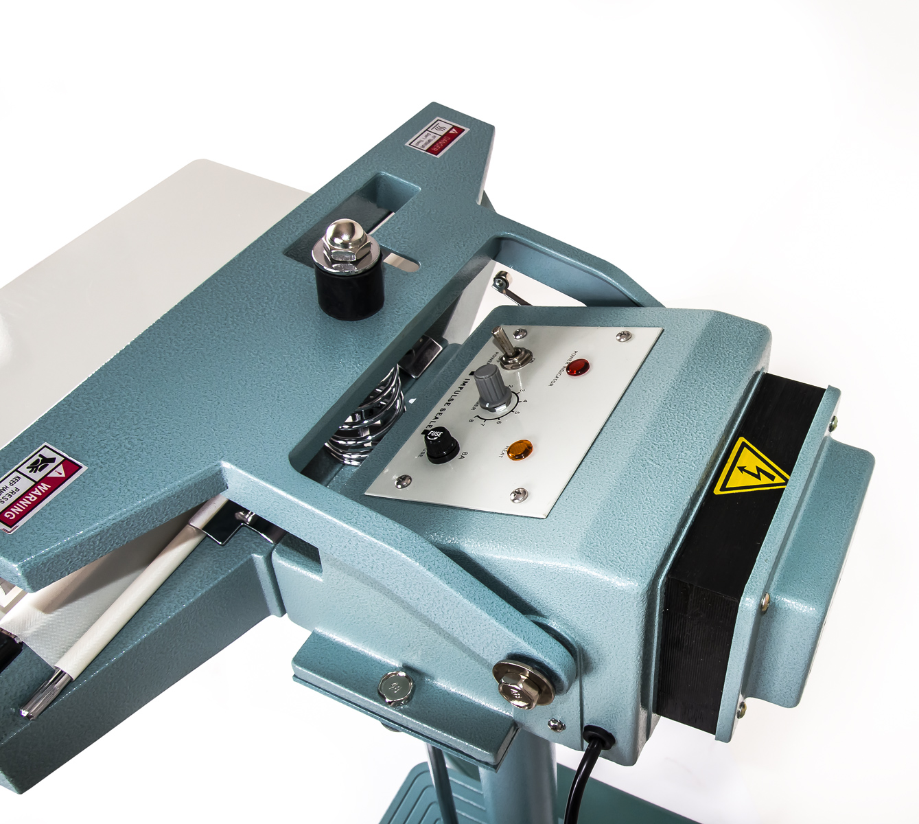 Lorsque l'on appuie sur la pédale, la mâchoire supérieure est pressée contre la mâchoire inférieure et, simultanément, la soudure est activée. Cette opération est contrôlée par un potentiomètre qui peut être utilisé pour contrôler la longueur de l'impulsion. La longueur de l'impulsion est directement liée à l'épaisseur de la feuille à souder. La commande ne contient qu'un interrupteur et des voyants lumineux pour l'alimentation et le soudage. Lorsque la pédale est relâchée, un puissant ressort ramène la mâchoire supérieure à sa position initiale.
