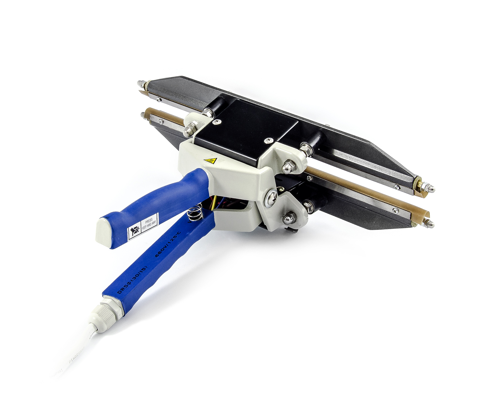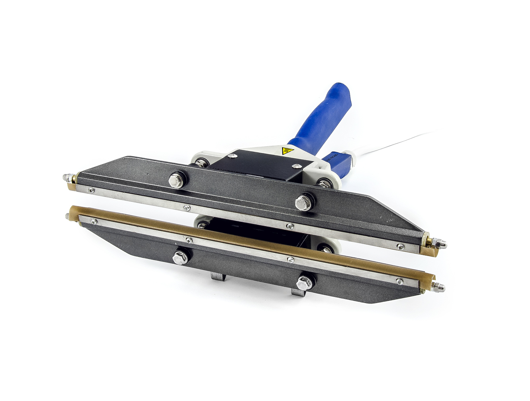 30 cm de long et sont recouvertes de fils de résistance chauffants de 5 mm de large, cachés sous un ruban de téflon résistant à la chaleur pour empêcher la feuille de fusionner avec le fil fusible. La soudure s'effectue uniquement en serrant la poignée (serrage). La soudure obtenue a une largeur de