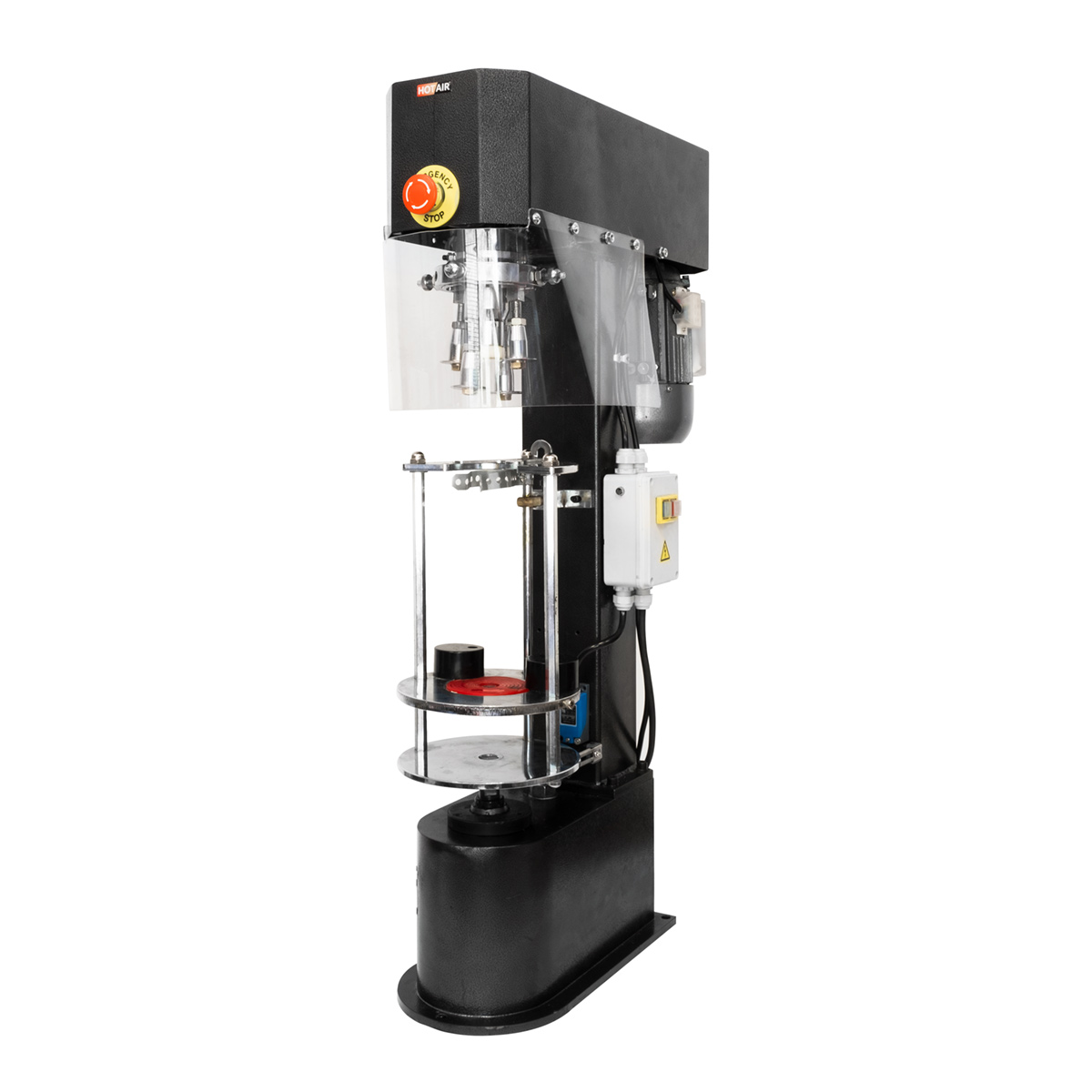Boucheuse électrique de paillasse pour capsules en aluminium pour le bouchage de bouteilles en verre avec des capsules en aluminium non filetées et inviolables.