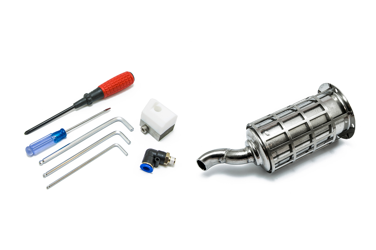 Contenu de l'emballage : extrudeuse, support, 2 bottes de soudage, accessoire à air chaud de rechange, outils d'entretien.